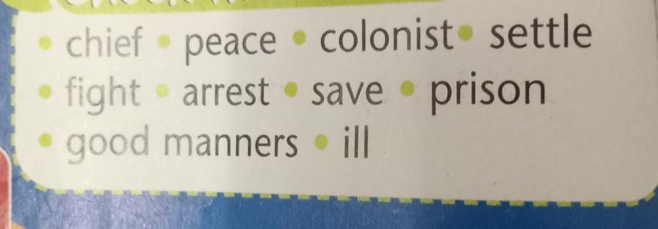 На русском: главный, мир, колонист (или поселенец), решать, битва, арестовать, сохранить, тюрьма, хорошие манеры, заболевания.