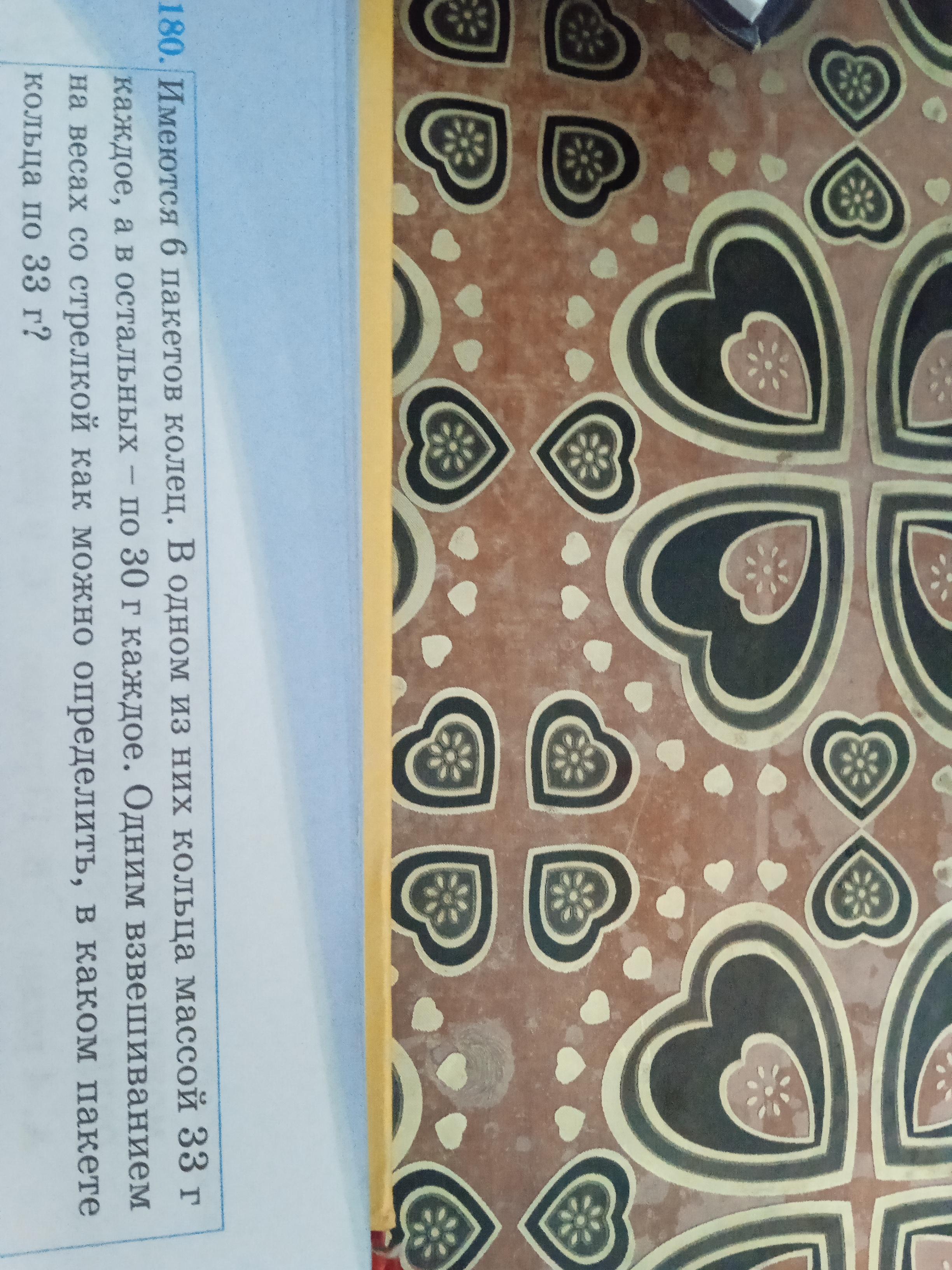 Помогите решить задачу пожалуйста; Имеются 6 пакетов колец. В одном из них кольца массой 33 г каждое, а в остальных- по 30 г каждое. Одним взвешиванием на весах со стрелкой как можно определить, в каком пакете кольца по 33 г.
