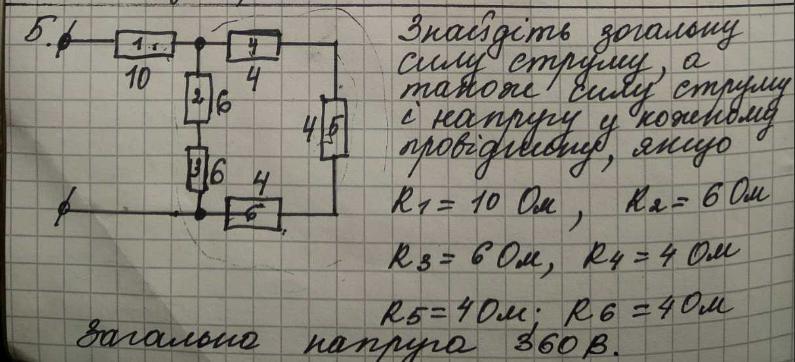 Знайдіть загальну силу струму а також силу струму і напругу у кожному провіднику, якщо