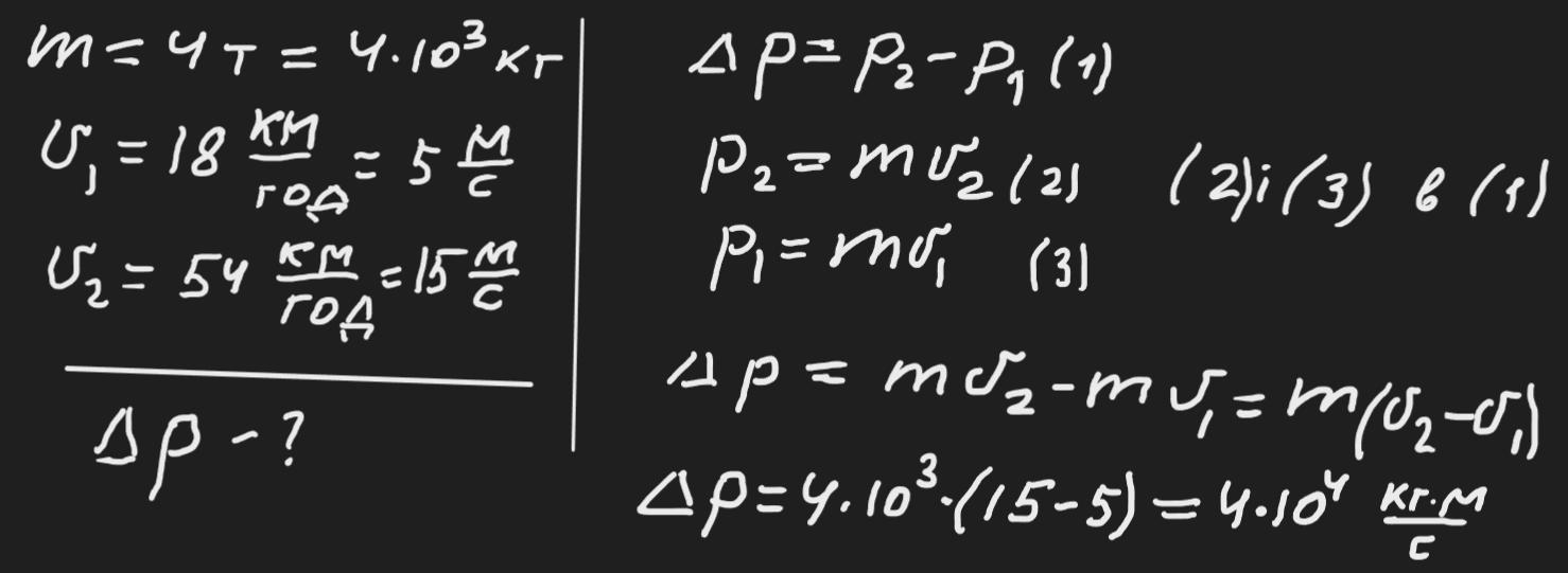 АВТОМОБiЛЬ масою 4 т рухаючись прямолінійно збільшив свою швидкість від 18 км / год до 54 км / год . Визначте зміну імпульсу
