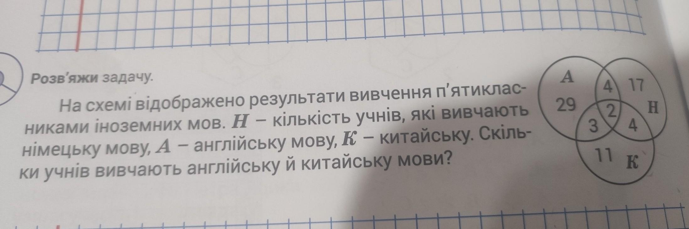 Отже китайську і англійську мову вивчають 2+3=5 учнів