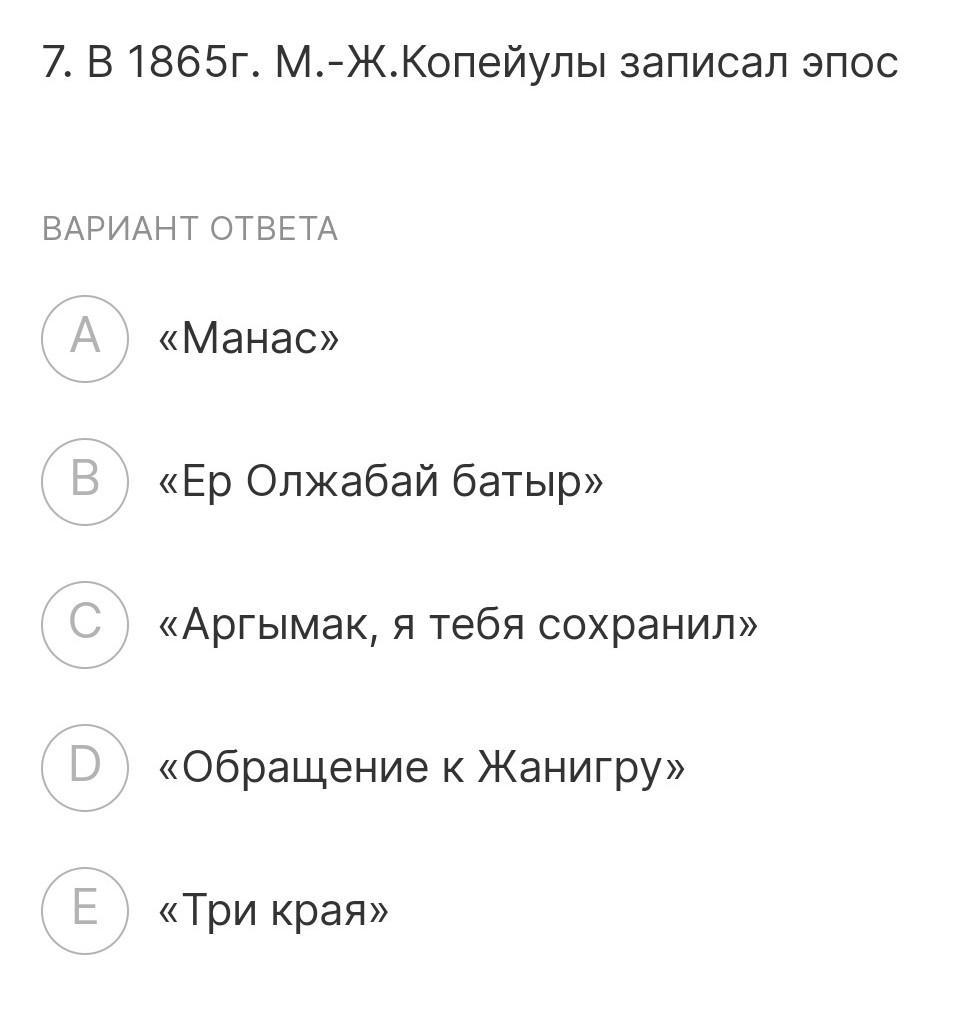 7. В 1865г. М.-Ж.Копейулы записал эпос ВАРИАНТ ОТВЕТА A «Манас» B «Ер Олжабай батыр» C) «Аргымак, я тебя сохранил» D) «Обращение к Жанигру» E «Три края»