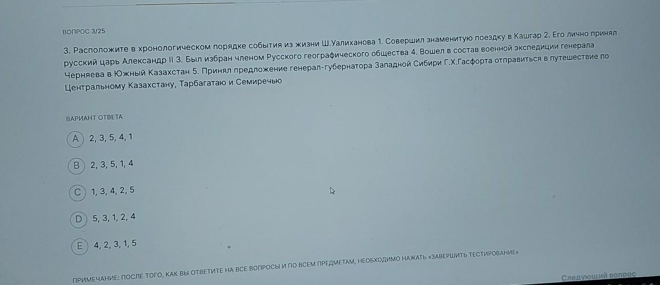ВОПРОС 3/25 3. Расположите в хронологическом порядке события из жизни Ш.Уалиханова 1. Совершил знаменитую поездку в Кашгар 2. Его лично русский царь Александр II 3. Был избран членом русского географического общества 4. Вошел в состав военной экспедиции генерал Черняева в Южный Казахстан 5. Принял предложение генерал-губернатора Западной Сибири Г.Х.Гасфорта отправиться в путешеств Центральному Казахстану, Тарбагатаю и Семиречью ВАРИАНТ ОТВЕТА A 2, 3, 5, 4, 1 в 2, 3, 5, 1, 4 C) 1, 3, 4, 2, 5 D5, 3, 1, 2, 4 E) 4, 2, 3, 1, 5 попросы И ПО ВСЕМ ПРЕДМЕТАМ НЕОБХОДИМО НАЖАТЬ «ЗАВЕРШИТЬ ТЕСТИРОВАНИЕ>>