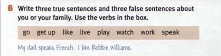 Ответ:I go to school. My brother plays football . My mum works in kitchen. I don’t like cheese. My dad works in cafe. My sister gets up early than me.
