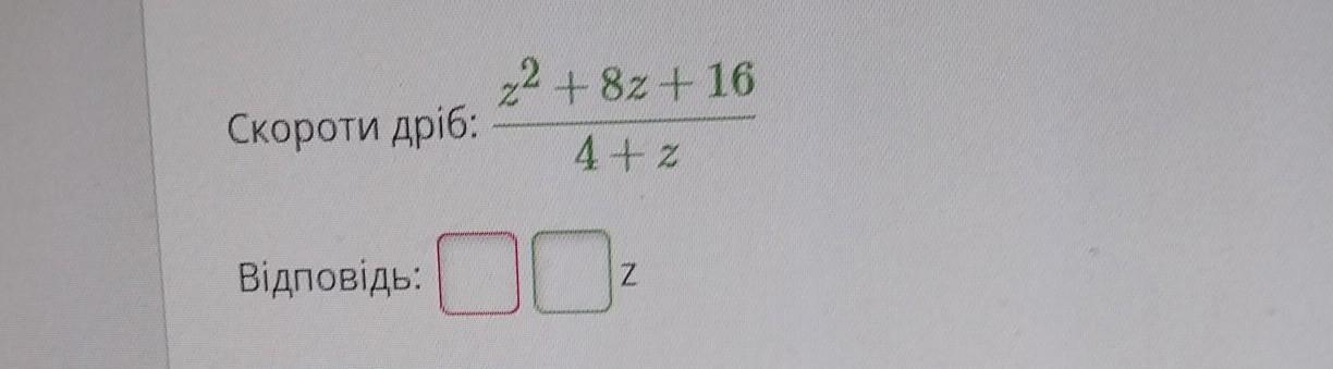 \displaystyle\bf\\\frac{z^{2}+8z+16 }{4+z} =\frac{z^{2} +2\cdot z\cdot 4+4^{2} }{4+z} =\frac{(4+z)^{2} }{4+z} =4+z\\\\\\Otvet \ : 4+z