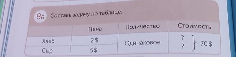 8Б Составь задачу по таблице. Хлеб Сыр Цена 2$ 5$ Количество Одинаковое Стоимость } ? ? 70$