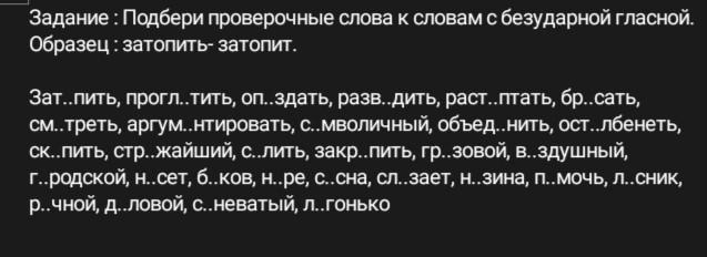 Подбери проверочные слова к словам с безударной гласн Образец : затопить- затопит. Зат..пить, прогл..тить, оп..здать, разв..дить, раст..птать, бр..сать, см..треть, аргум..нтировать, с..мволичный, объед..нить, ост..лбенет ск..пить, стр..жайший, с..лить, закр..пить, гр..зовой, в..здушный, г..родской, н..сет, б..ков, н..ре, с..сна, сл..зает, н..зина, п..мочь, л..сни р..чной, д..ловой, с..неватый, л..гонько