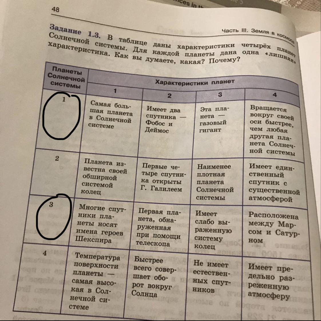 В таблице даны характеристики четырёх планет солнечной системы . для каждой планеты дана ещё одно лишная характеристика. Как вы думаете, какая? Почему?