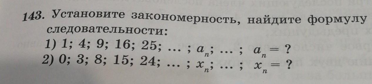 143. Установите закономерность, найдите формулу п-го члена по- следовательности: 1) 1; 4; 9; 16; 25; ...;a; ...; a 2) 0; 3; 8; 15; 24; ...; ; .. ; n 72 ? ? Плис помогите мне решить я поставлю тебе 100 лайков или оценок:3☹️