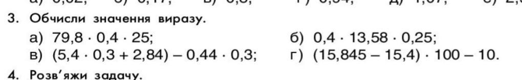 3. Обчисли значення виразу. a) 79,8 . 0,4 . 25; B) (5,4 0,3 + 2,84) 0,44 0,3; 6) 0,4 13,58 0,25; r) (15,845 - 15,4) 100 - 10. . СРОЧНО!!!
