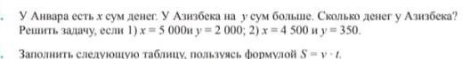 7. у Анвара есть х сум денег. У Азизбека на у сум больше. Сколько денег у Азизбека? Решить задачу, если 1) х = 5 000и у = 2 000; 2) х=4 500 и у = 350.