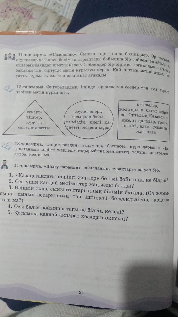 12 тапсырма.Фигуралардың ішінде орналасқан сөздер мен сөз тіркестерінен мәтін құрап жаз.24 бет.дам 50 балла а может и больше