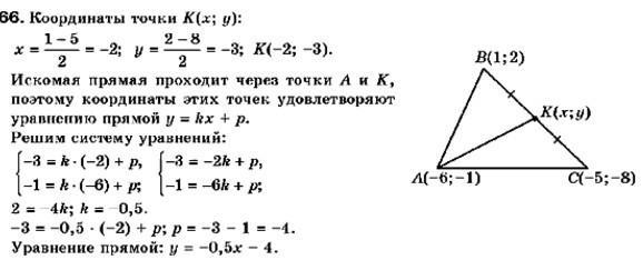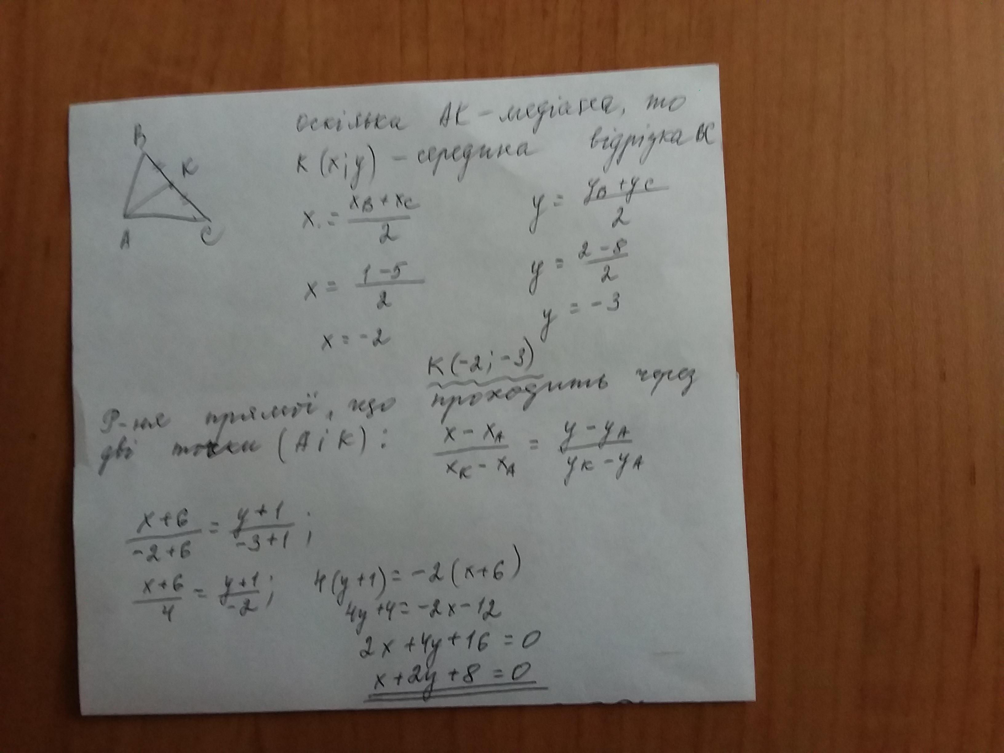 Точки A (-6;-1), B (1;2), C(-5;-8), є вершини трикутника ABC.Скласти рівняння прямої, яка містить медіану AД.