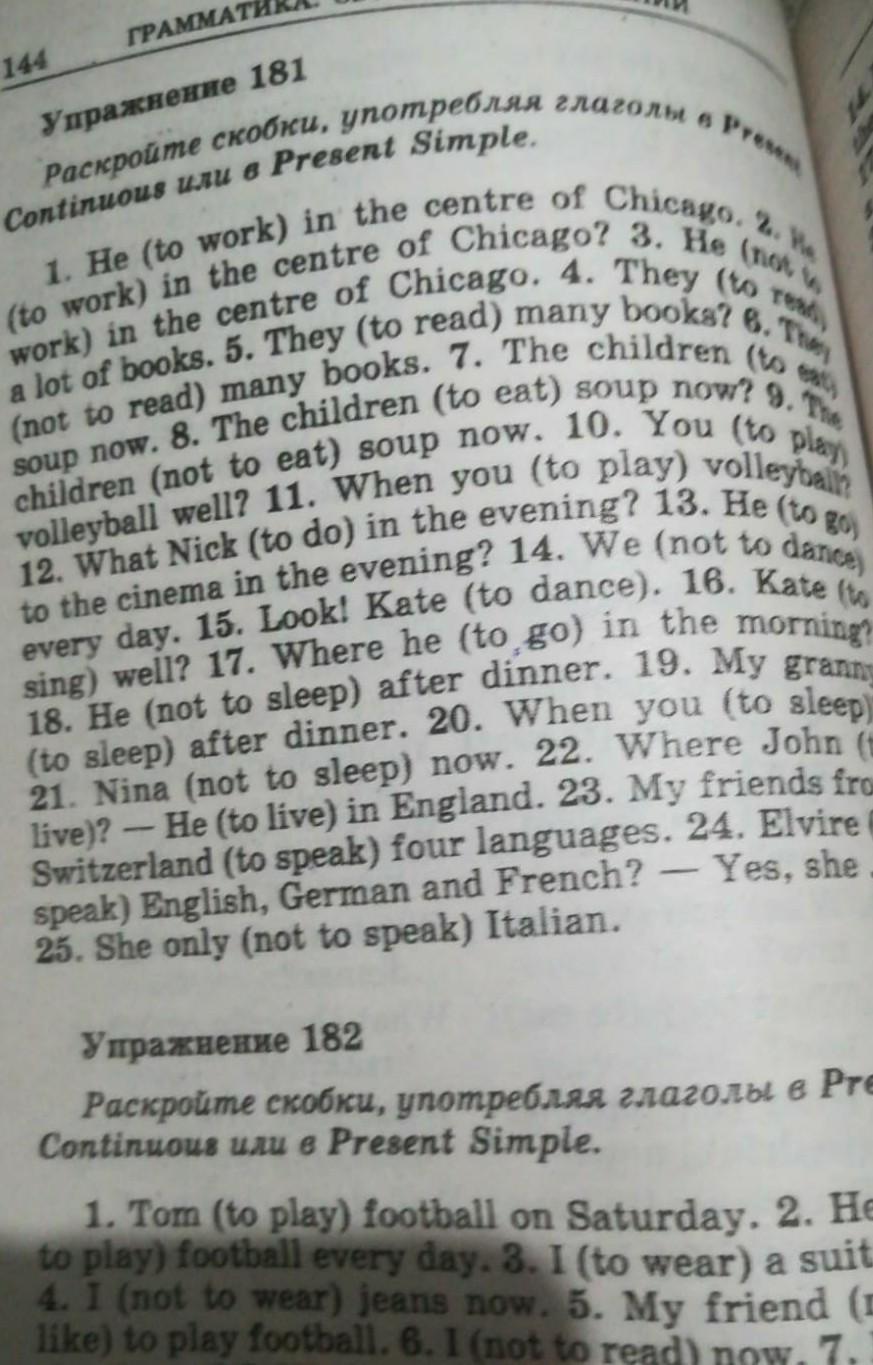 144 ГРАММАТИКА. СВОРН кний Упражнение 181 Раскройте скобки, употребляя глаголы в Р Continuous uлu e Present Simple. (to work) in the centre of Chicago? 3. He ( 1. He (to work) in the centre of Chicago. 2 work) in the centre of Chicago. 4. They (to a lot of books. 5. They (to read) many books? 6. (not to read) many books. 7. The children ( soup now. 8. The children (to eat) soup now? children (not to eat) soup now. 10. You (te volleyball well? 11. When you (to play) voll 12. What Nick (to do) in the evening? 13. He to the cinema in the evening? 14. We (not to every day. 15. Look! Kate (to dance). 16. B sing) well? 17. Where he (to go) in the m 18. He (not to sleep) after dinner. 19. My (to sleep) after dinner. 20. When you (to 21. Nina (not to sleep) now. 22. Where live)? - He (to live) in England. 23. My frie Switzerland (to speak) four languages. 24. speak) English, German and French? - Ye 25. She only (not to speak) Italian. ПОЖАЛУЙСТА ПОМОГИТЕ МНЕ