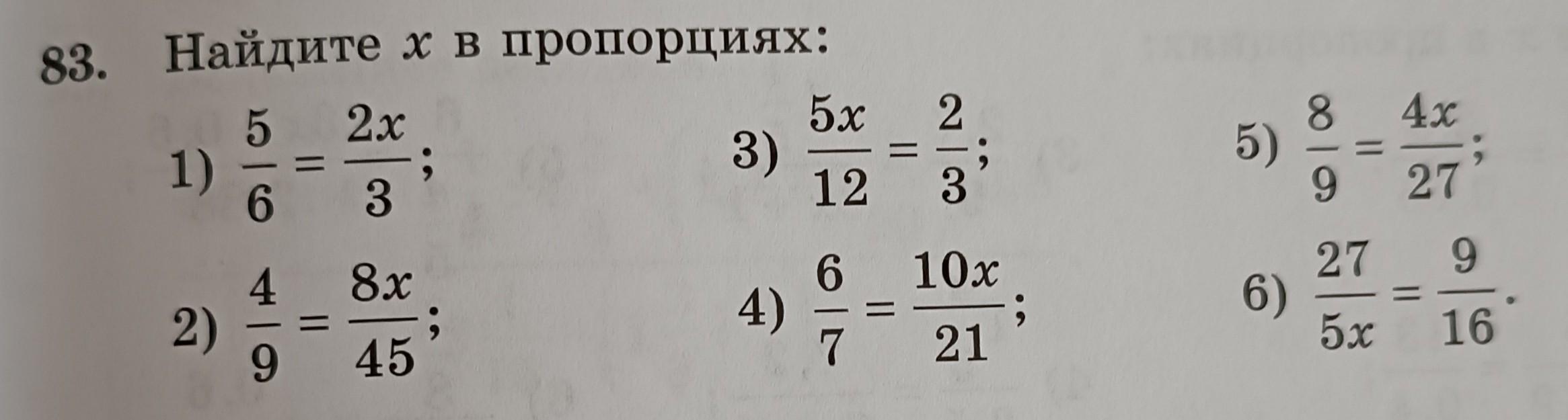 83. Найдите х в пропорциях: 5 2x 3 1) 2) - 6 69 = = 8x 45 3) 4) 5x 2 12 3 19 6 7 = = 10x 21 ; 5) 6) 818 9 27 5x по 4x = 27 9 16