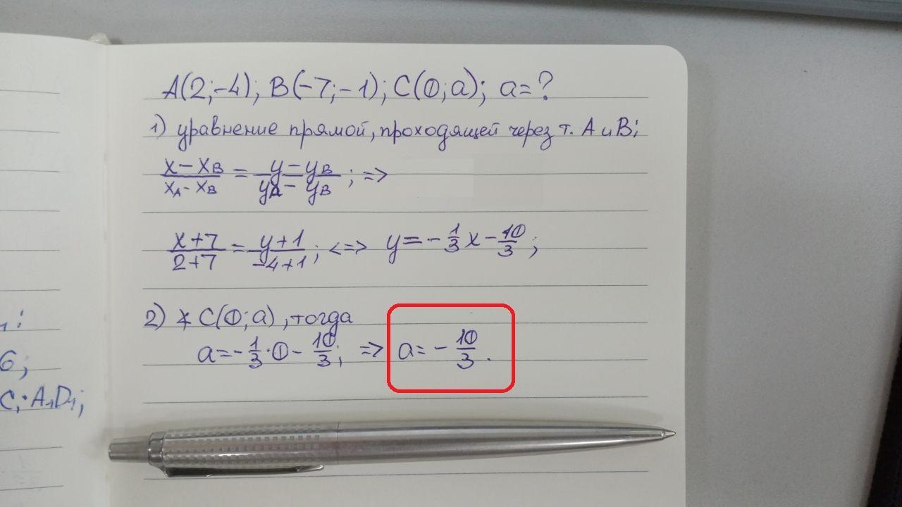 Не виконуючи побудови, визначте, при якому значенні а точки (2; -4) (-7; -1) (0; a) лежать на одній прямій