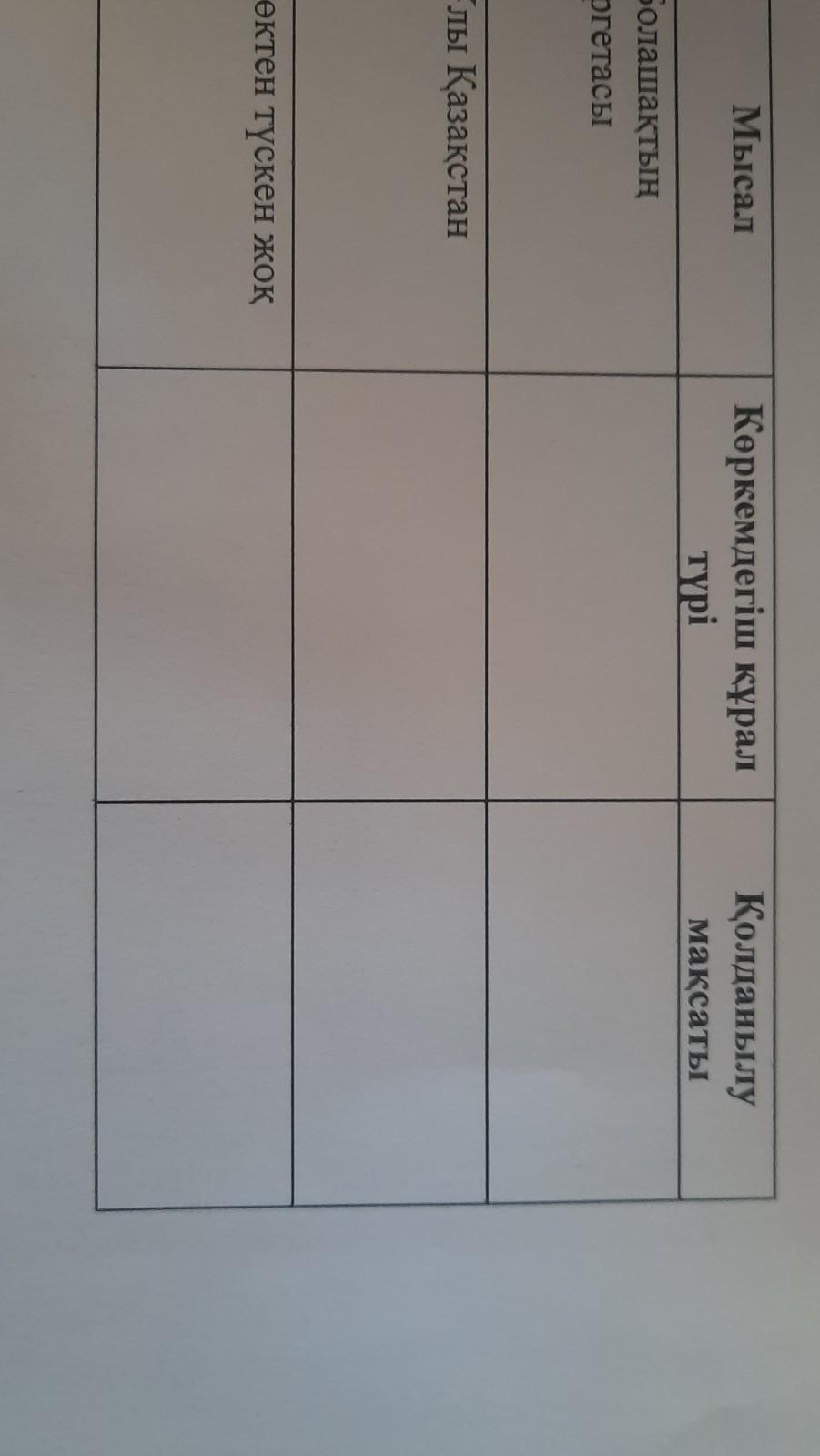 3. Мәтiндi негiзге ала отырып, кестені толтырыңыз. Көркемдегіш құрал турі Мысал Болашактын іргетасы Ұлы Казакстан Көктен түскен жок Қолданылу максаты