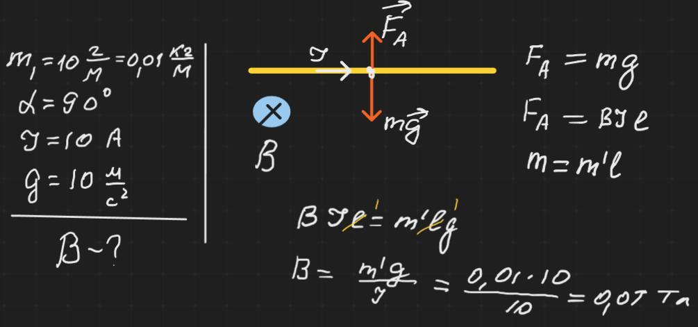 Провідник, кожен метр якого має масу 10 г, завис в однорідному магнітному полі перпендикулярно до його силових ліній. Визначте індукцію магнітного поля, коли сила струму в провіднику дорівнює 10 А. Вважайте, що g =10 м/с2.