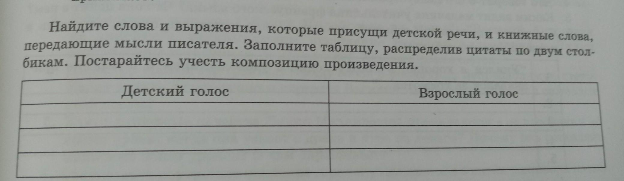 Найдите слова и выражения, которые присущи детской речи, и книжные слова передающие мысли писателя. Заполните таблицу, распределив цитаты по двум стол бикам. Постарайтесь учесть композицию произведения. Детский голос Взрослый голос