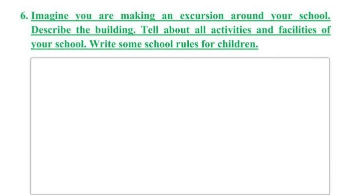тебе нужно написать про свою школу. описать здание, рассказать о мероприятиях и возможностях в твоей шк. и написать несколько школьных правил для детей.