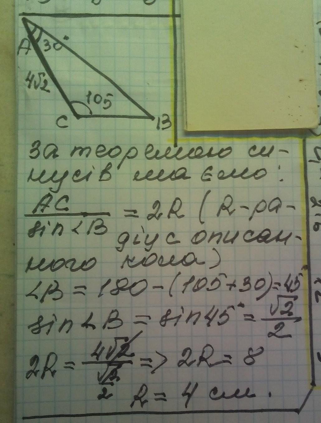 У трикутнику ABC AC = 4√2 см , A = 30 градусів , C = 105 градусів . Знайдіть радіус кола, описанного навколо трикутника.