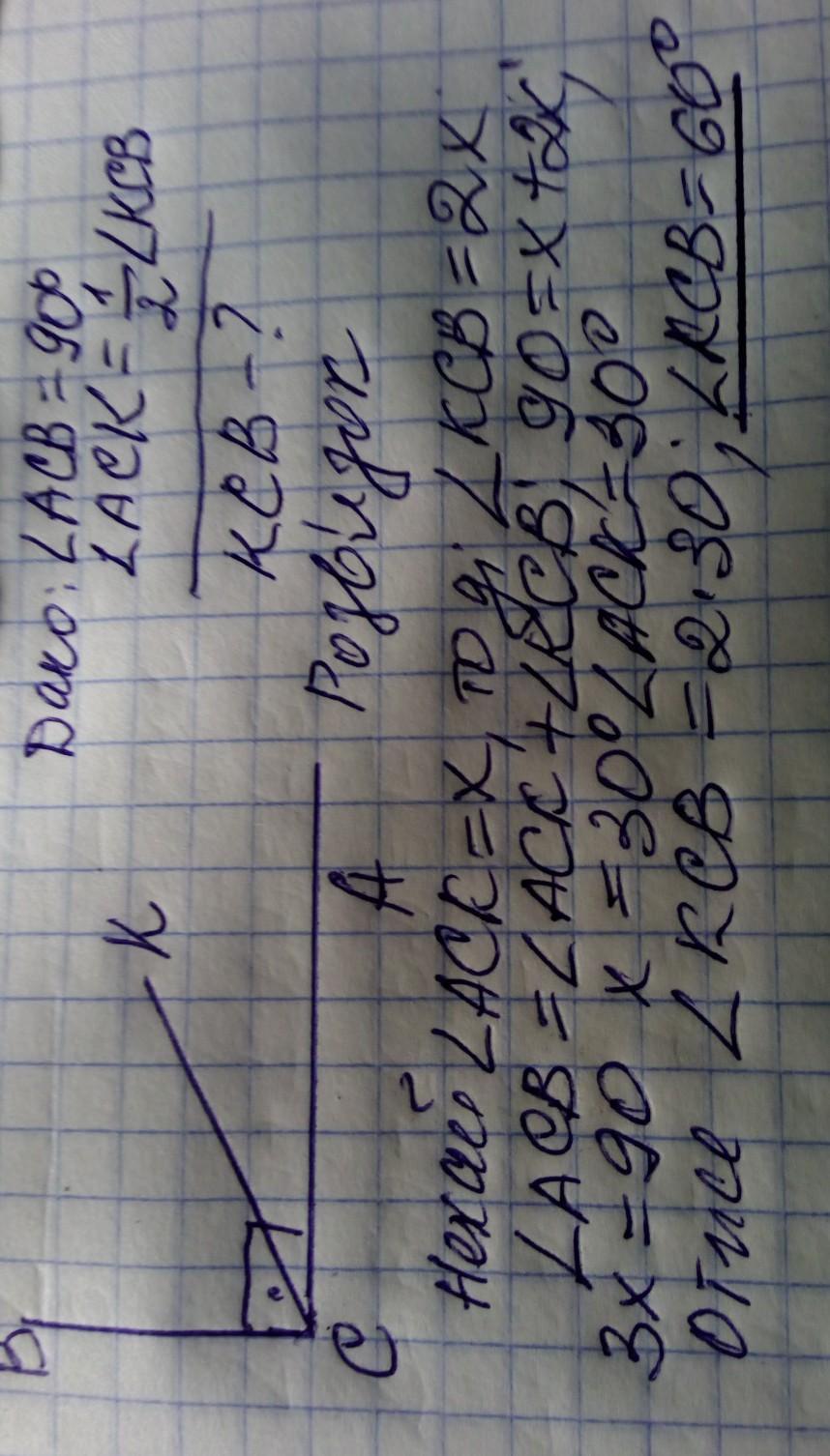 6. Між сторонами прямого кута АСВ проведено промінь СК, причому кут АСК дорівнює половині кута КСВ. Знайдіть кут КСВ.