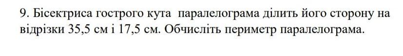 9. Бісектриса гострого кута паралелограма ділить його сторону на відрізки 35,5 см і 17,5 см. Обчисліть периметр паралелограма. ПОЖАЛУЙСТА СДЕЛАЙТЕ С УСЛОВИЕМ, РИСУНКОМ, И ПОЛНЫМ РЕШЕНИЕМ.