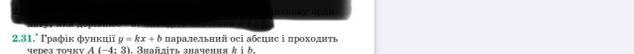 A(-4;3)=> x= -4 ; y=3 - координаты точки , через которую проходит график .Если график линейной функции параллелен к оси обсцисс , то коэффициент наклона(k) не имеется, поэтому , k=0, b-точка пересечения графика с осью Оу , данный график пересекается с осью Оу в точке y=3 , значит , b=3 .