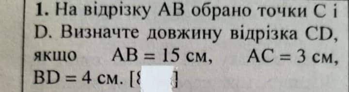 На відрізку АВ обрано точки С і D. Визначте довжину відрізка СD, якщо АВ = 15 см, АС = 3 см, ВD = 4 см