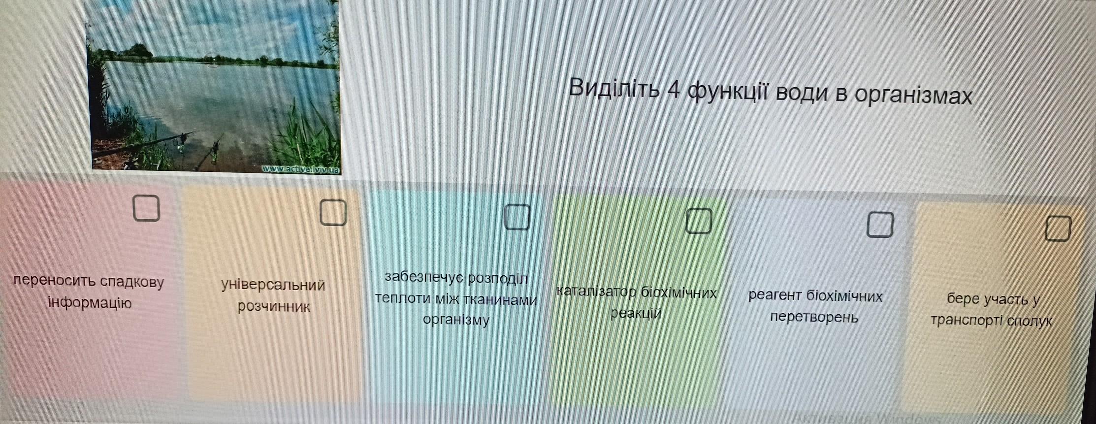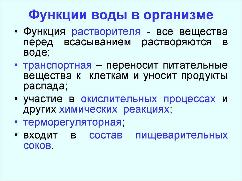 Ответ: універсальний розчинник, забезпечує розподіл теплоти між тканинами організму, бере участь у транспорті сполук.