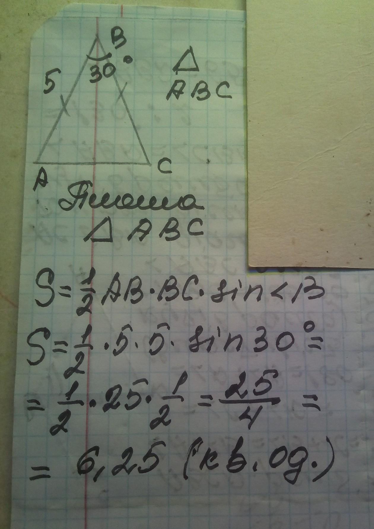 S=1/2 * 5 * 5 * sin30 = 1/2 * 25 * 1/2 = 6,25 см²
