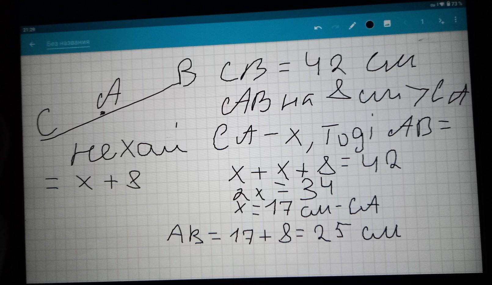 На відрізку СВ що дорівнює 42см взята точка А знайдіть довжену відрізка АВ якщо вона на 8см довша за СА.
