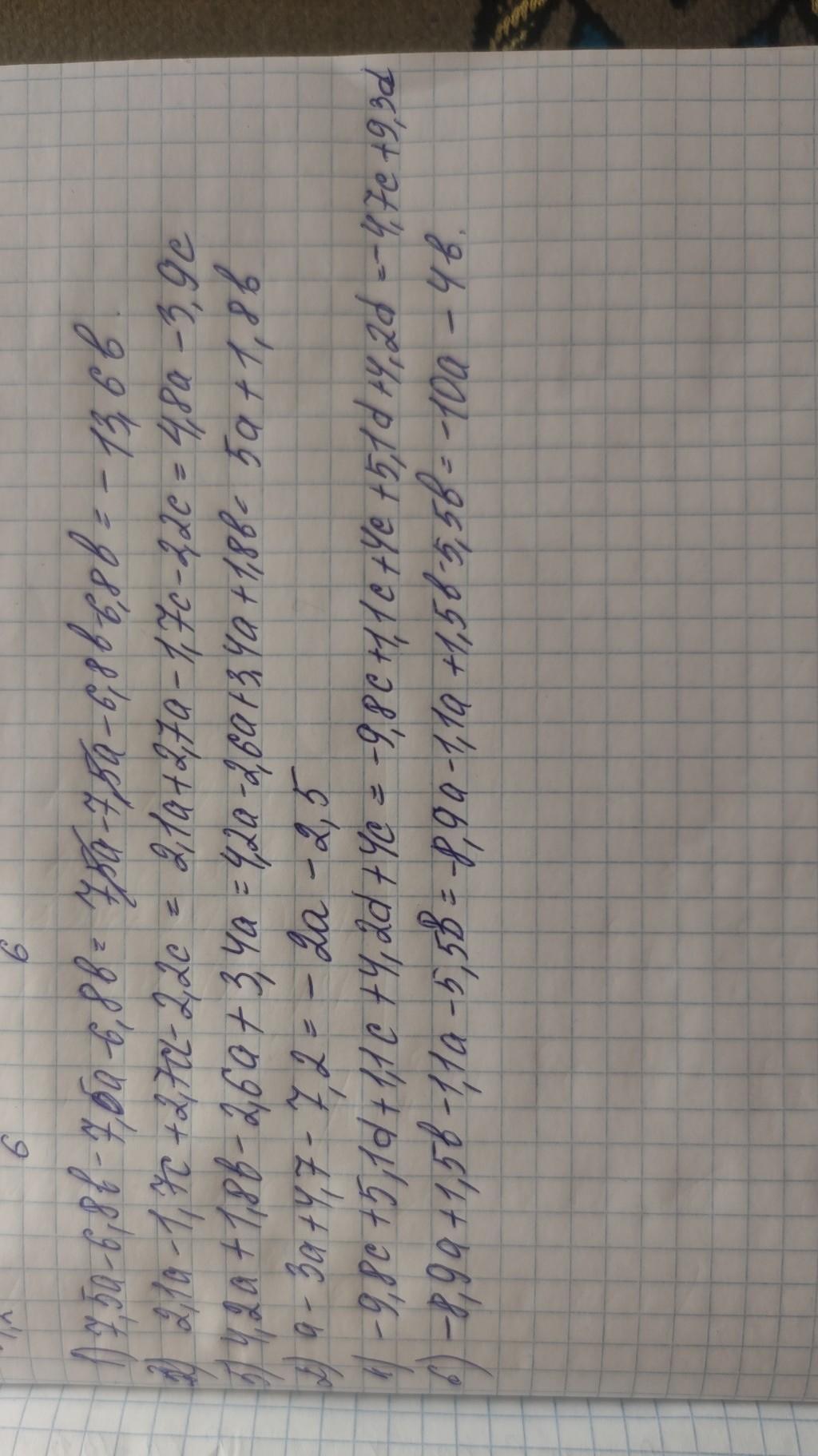 3. Приведите подобные слагаемые. 1) 7,5a-6,8b- 7,5a-6,8b 3) 2,1a - 1,7c + 2,7a-2,2c 5) 4,2а + 1,8b - 2,6a + 3,4a 2) a-3a +4,7 - 7,2 4) -9,8c + 5,1d+1,lc +4,2d+4c 6) -8,9a + 1,5b -1,1a-5,5b