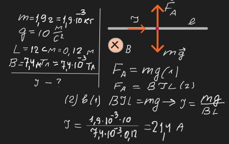Сила струму в провіднику довжиною L і масою m дорівнює I. Якщо помістити провідник у магнітне поле напруженістю B, сила тяжіння буде зрівноважена силою Ампера. Знайдіть силу струму у провіднику, якщо L = 12 см, m = 1,9 г, а B = 7,4 мТл. Побудуйте рисунок до задачі, укажіть на ньому напрямок сили струму та напрямок вектора індукції магнітного поля, які не суперечать умовам задачі.