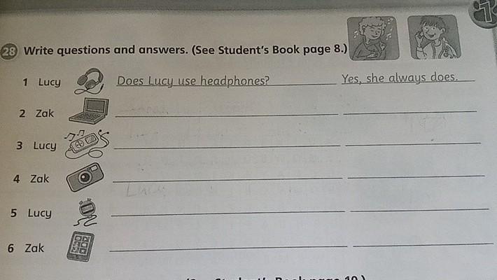 28 Write questions and answers. (See Student's Book page 8.) Does Lucy use headphones? 1 Lucy 2 Zak 3 Lucy 4 Zak 5 Lucy 6 Zak No: Yes, she always does.