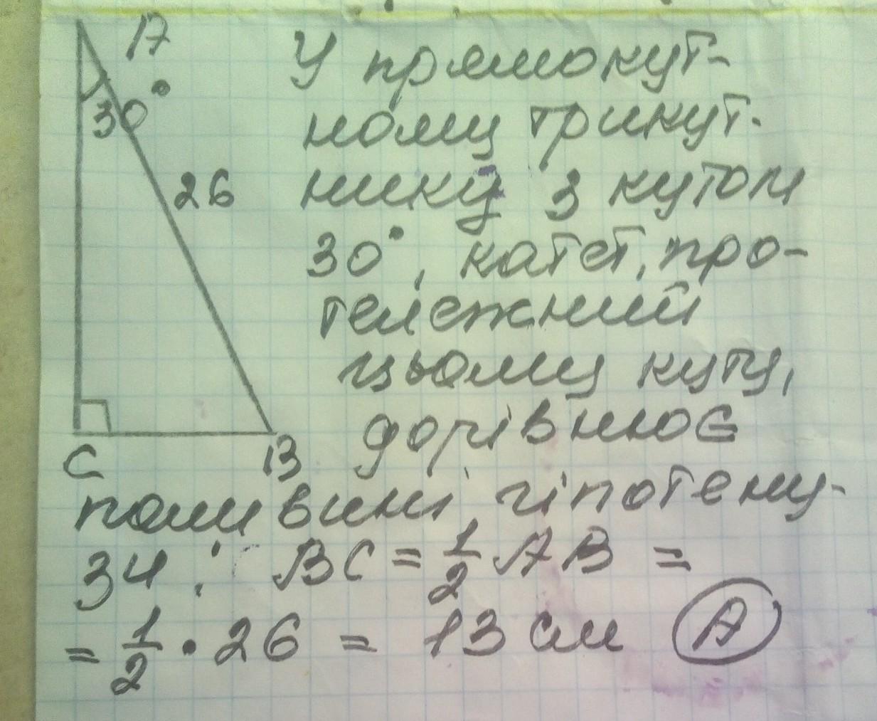 Прямокутному трикутнику один із гострих кутів дорівнює 30º Гіпотенуза дорівнює 26 см. Знайдіть катет, протилежний цьому куту. A. 13 с Б. 26 см В. 52 см Г. 56 см