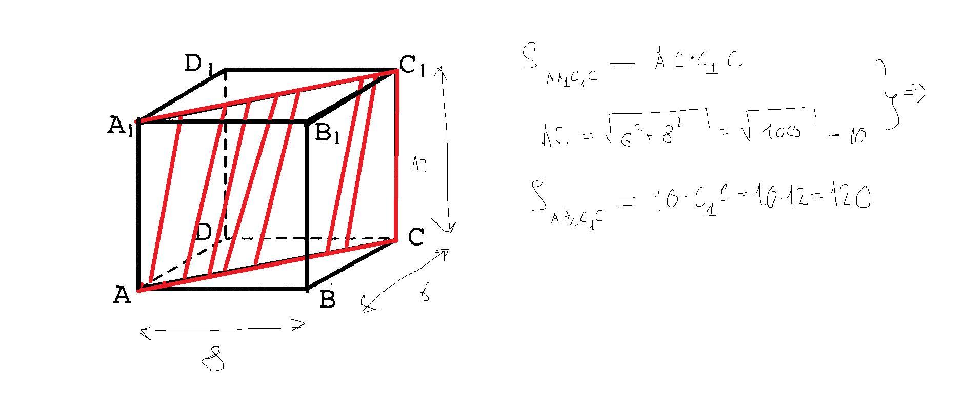 у прямокутному паралелепіпеді abcda1b1c1d1 сторони основи дорівнюють 6 і 8 см а бічне ребро 12 Знайдіть площу перерізу проведеного через точки це С,С1,А