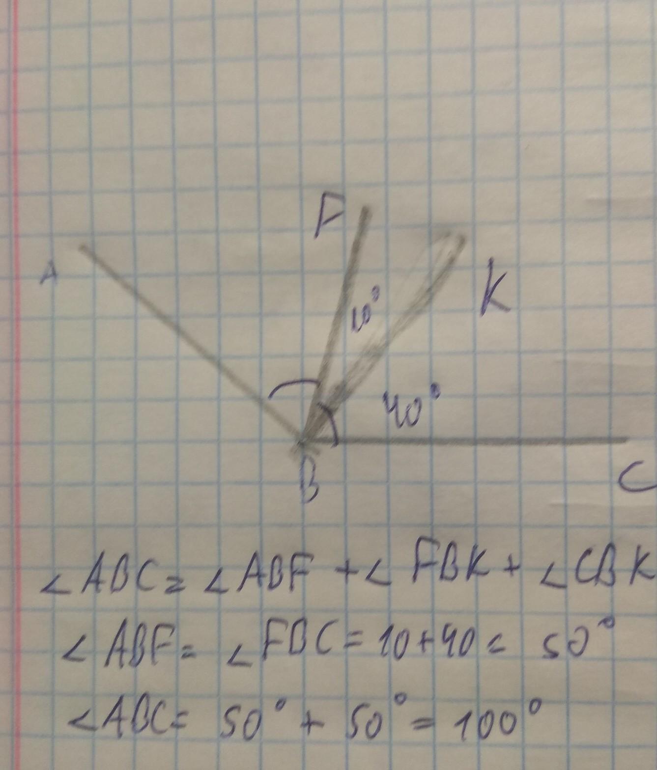 промінь bf бісектриса кута abc. промінь bk проходить між сторонами кута abc. Відомо , що кут KBC = 40° KBF=10°. Знайдіть кут abc