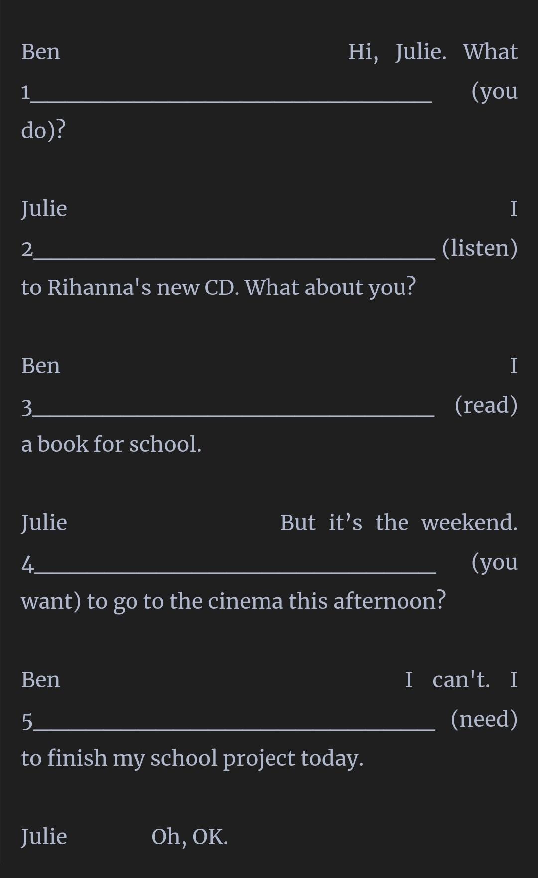 Julie But it’s the weekend. 4_______________________ (you want) to go to the cinema this afternoon?