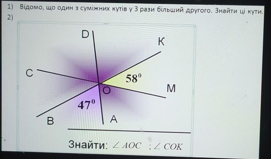 Відомо, що один з суміжних кутів у 3 рази більший другого. Знайти ці кути. СРОООЧНООО!!!!