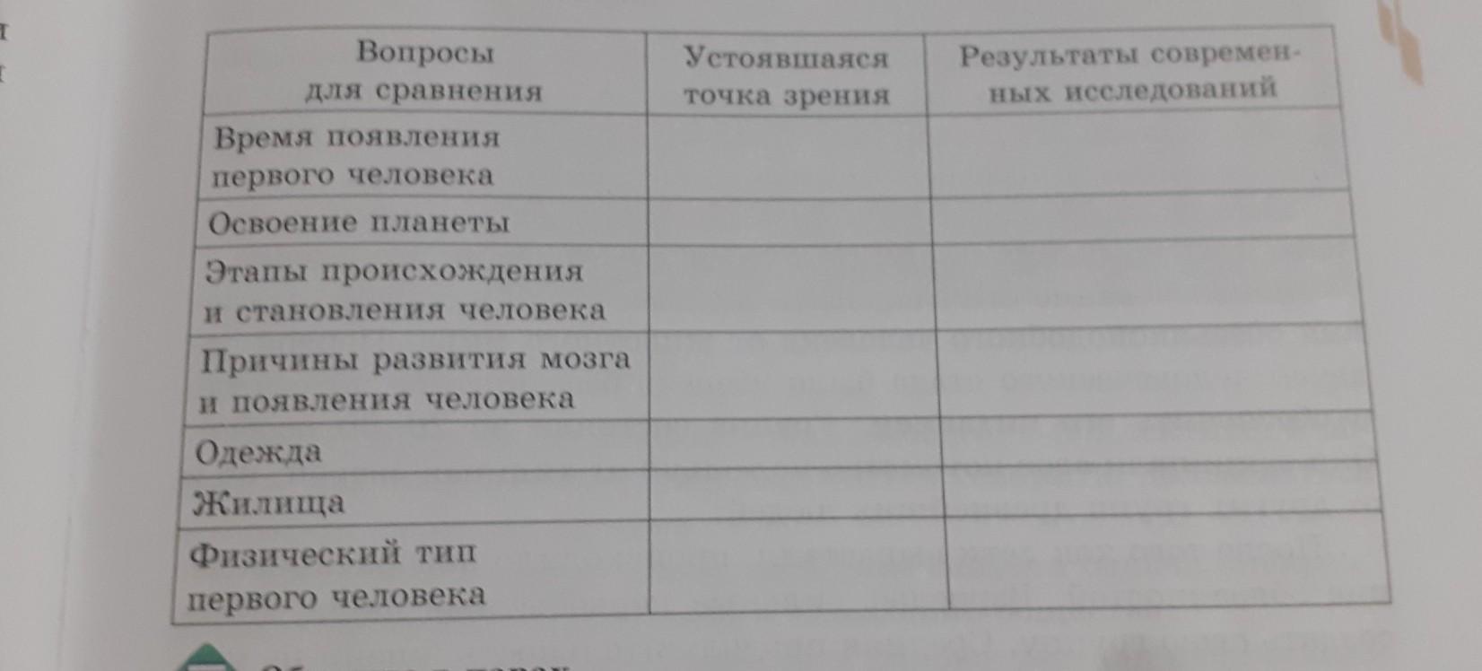 Вопросы для сравнения Время появления первого человека Освоение планеты Этапы происхождения и становления человека Причины развития мозга и появления человека Одежда Жилища Физический тип первого человека Устоявшаяся точка зрения Результаты современ- ных исследований