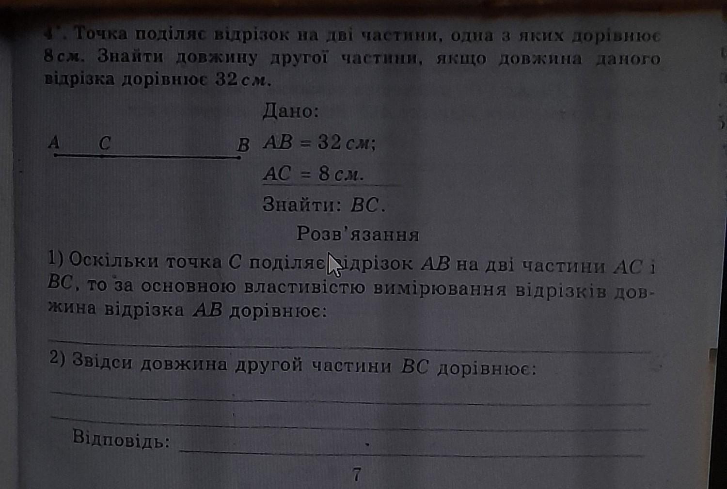 4. Точка поділяє відрізок на дві частини, одна з яких дорівнює 8 см. Знайти довжину другої частини, якщо довжина даного вiдрiзка дорівнює 32 см. A С Дано: AB = 32 см; АС = 8 см.
