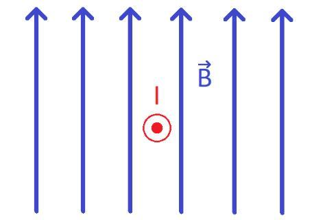 На рисунку зображено напрямок струму в провіднику та напрямок ліній магнітної індукції магнітного поля. Визначте напрямок сили Ампера, що діє на провідник. Відповідь представте у вигляді рисунка.