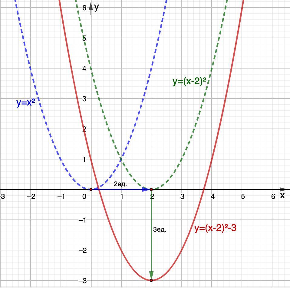 График у = (х - 2)² - 3 получим из графика у = (х - 2)² путем сдвига на 3 единицы вниз.