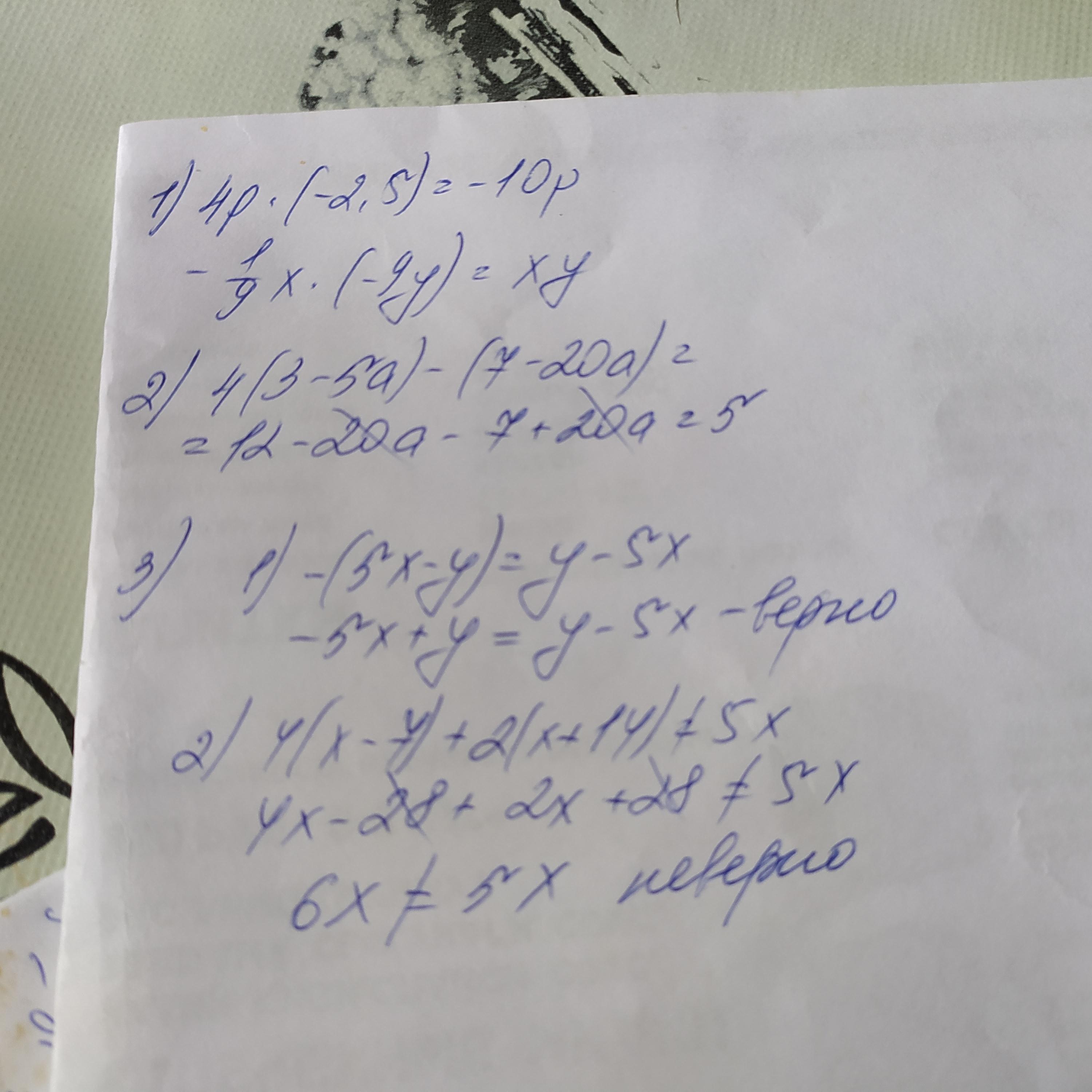 1) -(5 x - у) = у - 5х. 2) 4(x- 7) + 2(x + 14) = 5x.