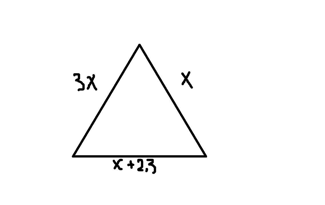 Если одна сторона треугольника в 3 раза меньше другой ⇒ она больше этой стороны в 3 раза ( обозначим одну сторону как "х" другую как "3х". Так как "х" меньше другой стороны на 2,3 дм ⇒ третья сторона на 2,3 дм больше первой. И так как периметр равен сумме всех сторон ⇒ составим уравнение: