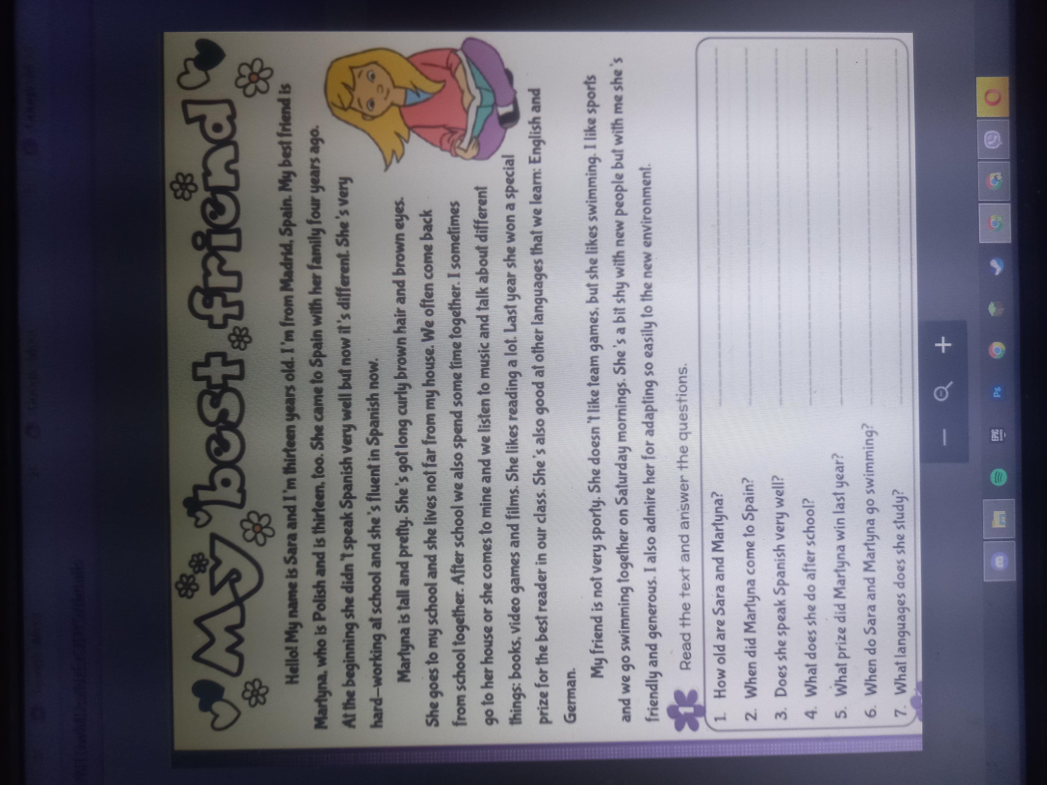 1. How old are Sara and Martyna?2. When did Martyna come to Spain? 3. Does she speak Spanish very well? 4. What does she do after school? 5. What prize did Martyna win last year? 6. When do Sara and Martyna go swimming? 7. What languages does she study