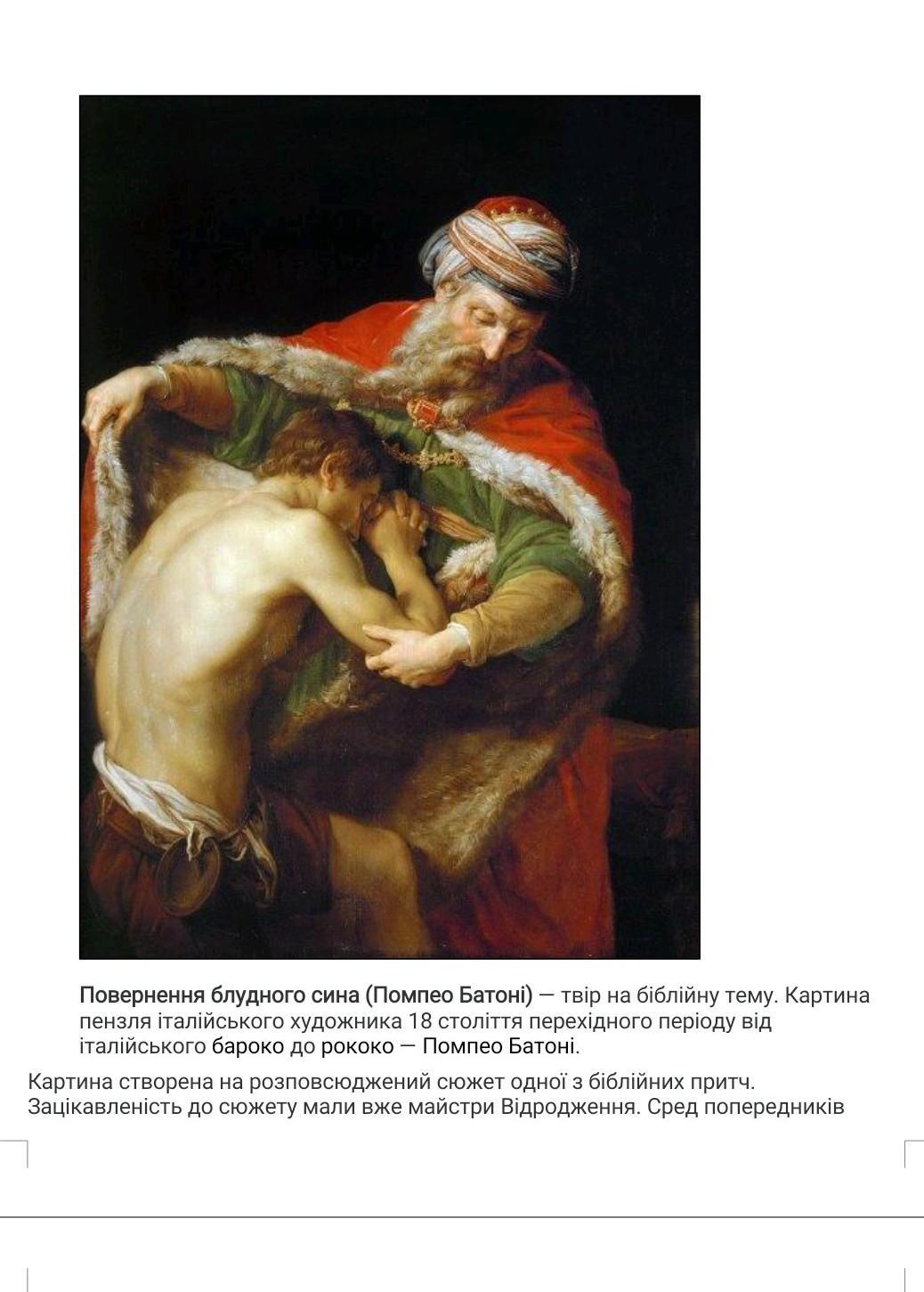 Объяснение:Это самое большое полотно Рембрандта на религиозную тему.На небольшой площадке перед домом собрались несколько человек. В левой части картины изображён спиной ко зрителю коленопреклонённый блудный сын. Его лица не видно, голова написана в profil perdu. Отец нежно касается плеч сына, приобнимая его.