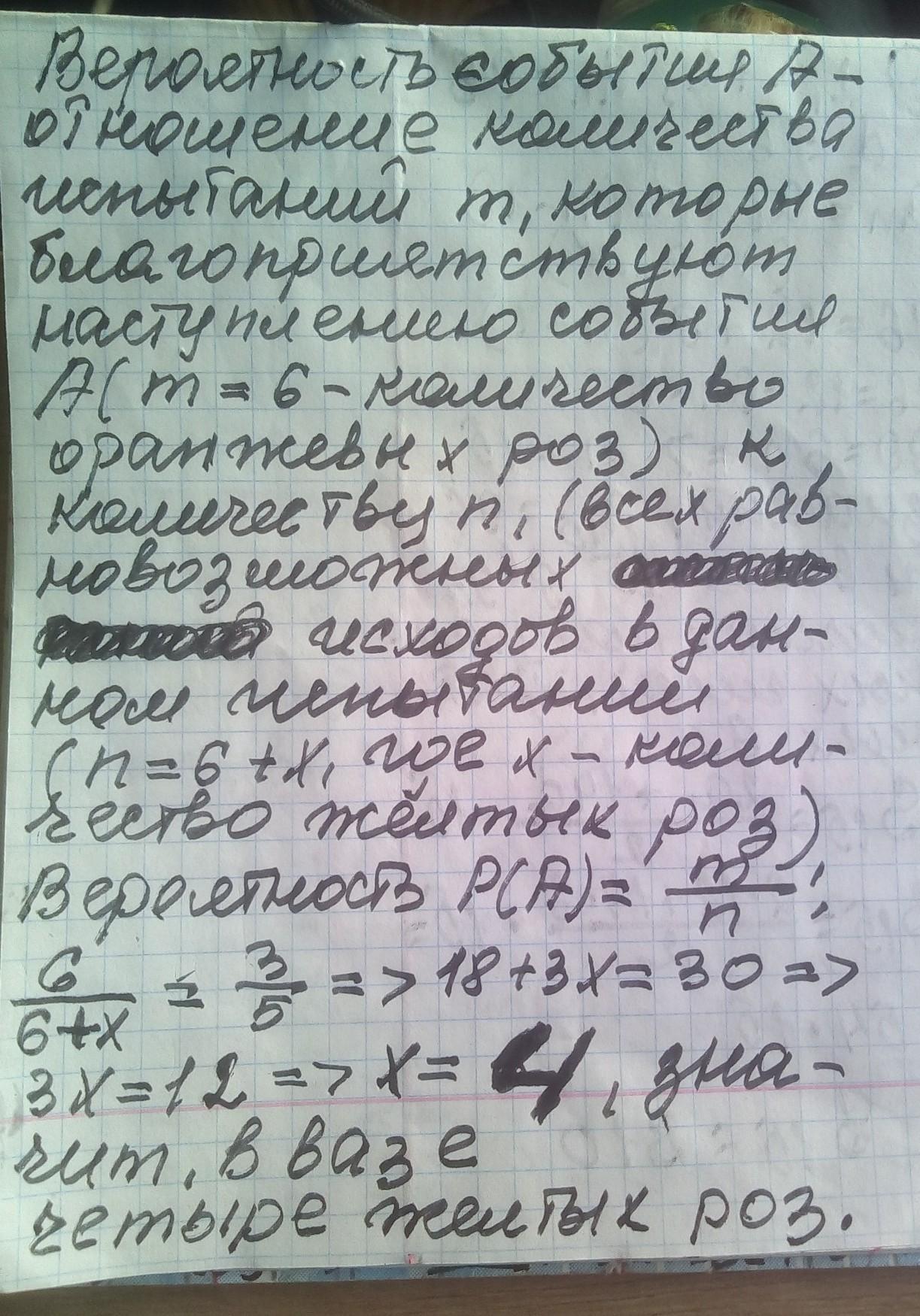 В вазе 6 оранжевых и несколько желтых роз. Вероятность взять из вазы нечаянно оранжевую розу 3/5.Сколько желтых роз в вазе?Пожалуйста дайте пошаговое решение. Спасибо большое.