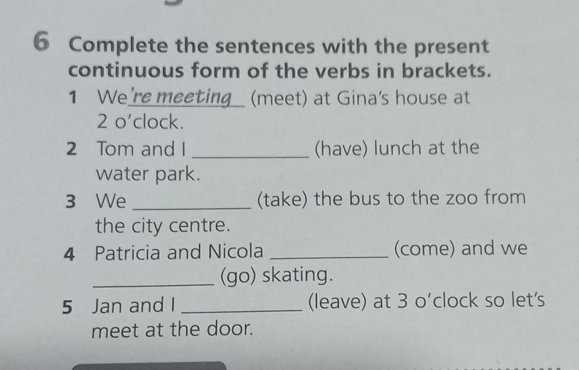 6 Complete the sentences with the present continuous form of the verbs in brackets. 1 We're meeting (meet) at Gina's house at 2 o'clock. 2 Tom and I (have) lunch at the (take) the bus to the zoo from (come) and we (leave) at 3 o'clock so let's water park. 3 We the city centre. 4 Patricia and Nicola 5 Jan and I (go) skating. meet at the door.